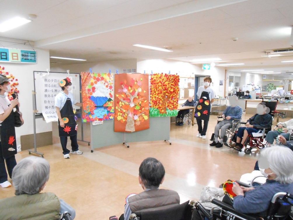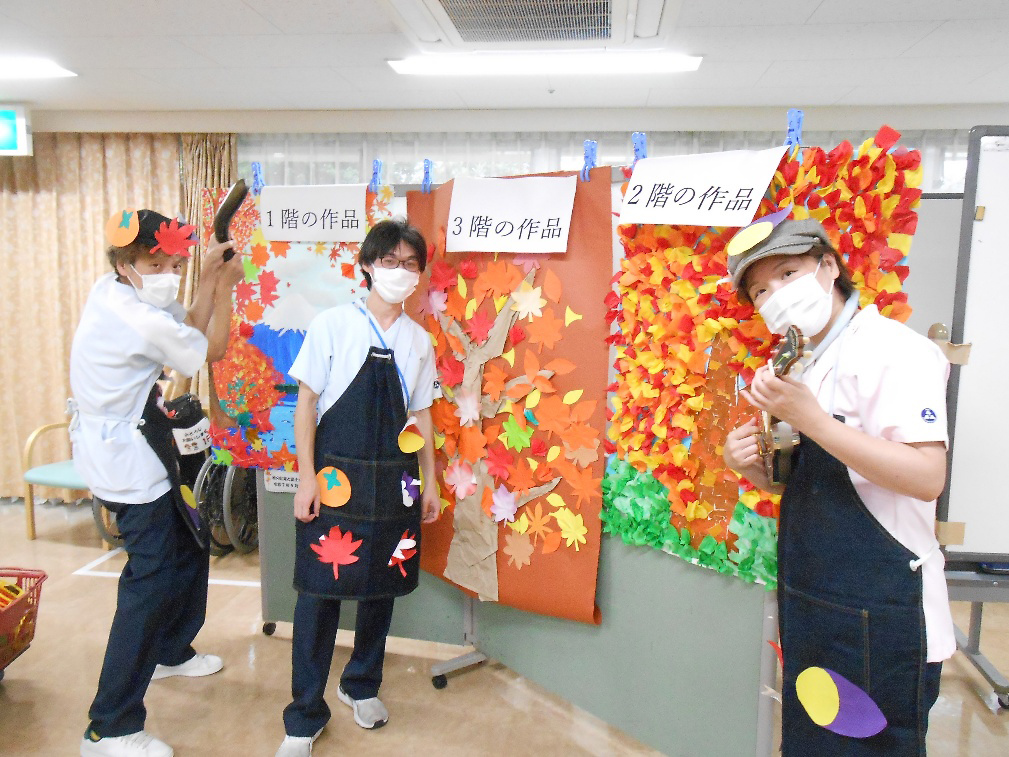 行事イベント当日に向けて利用者の皆様に紅葉をイメージした作品を作っていただきましたヾ(*´∀`*)ノ